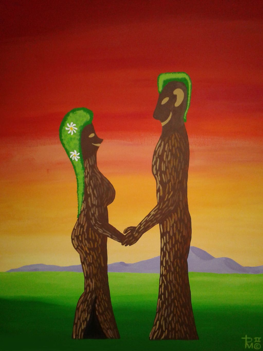 These are people trees! I named them Adam and Eve and used a similar color scheme as that in West Texas Ingenuity. The original was also painted on a 24"X36" canvas turned vertically.