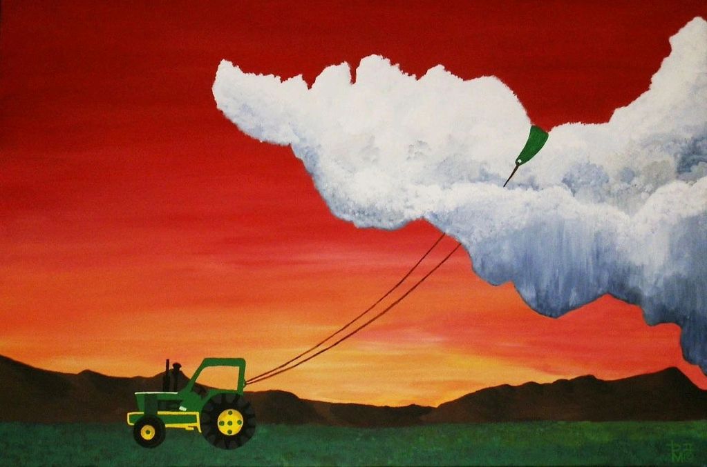 My first large painting (24"X36") on a horizontal canvas. The mountains were inspired by the area around Van Horn, TX where the elevation is the highest in the state at around 5,000 feet. It hung on the wall for over a year because I knew it needed something more, but couldn't figure out what. One day I got the idea to add a tractor pulling the storm cloud over the parched field. I pulled it off t