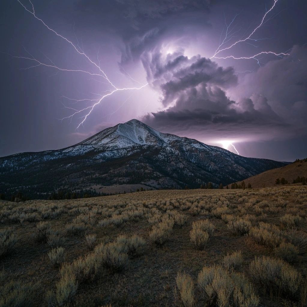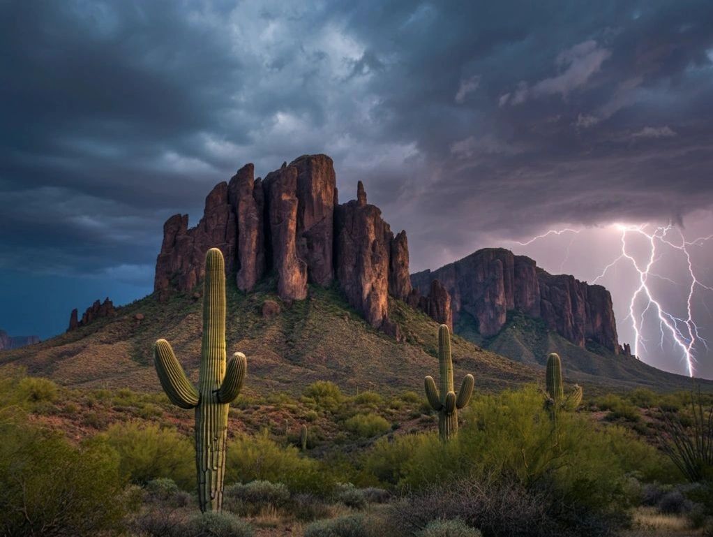 The top of the Superstition Mountains in Apache Junction, AZ points to the clouds and then the eye is drawn to the lightning which brings the focus down and towards the saguaros which leads back into a visual loop that repeats the process keeping you in the photo.